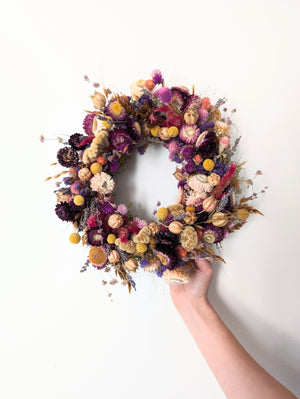 Every flower is farm-grown, hung to dry in my home studio, and artfully designed to create a one-of-a kind everlasting floral design